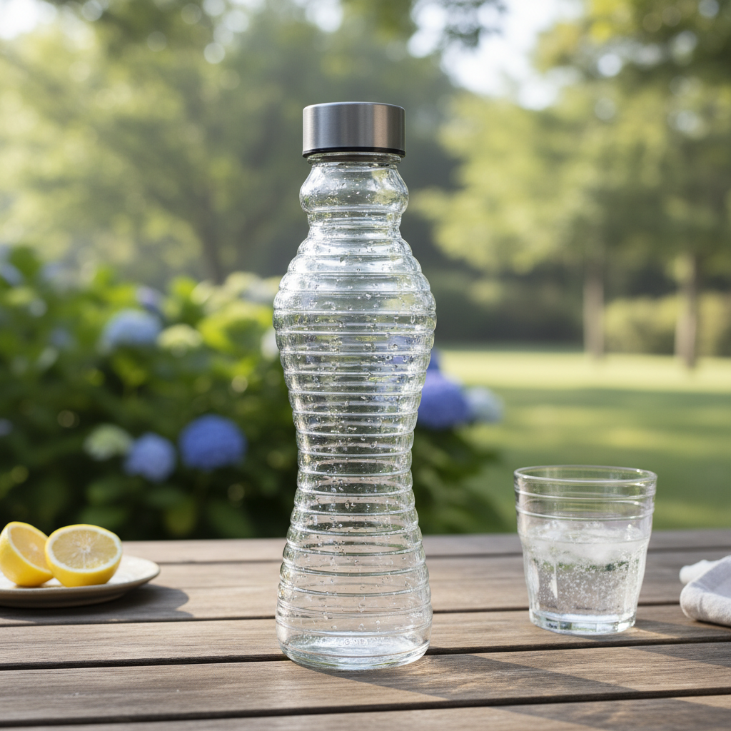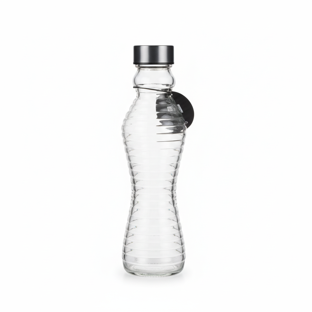 Kjo shishe prej qelqi transparent me kapacitet 500 ml është zgjidhje ideale për servirjen e ujit, lëngjeve apo pijeve të tjera në tryezë apo në zyrë. Struktura e saj e riforcuar dhe dizajni me vija horizontale ofrojnë kapje të sigurt dhe pamje moderne. Gryka rrethore lehtëson hedhjen e lëngjeve, ndërsa tapi metalike ndihmon në ruajtjen e freskisë.