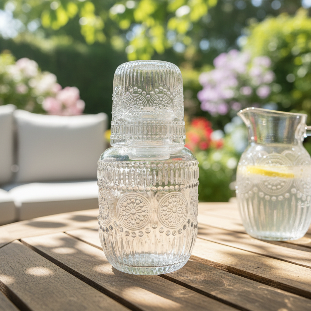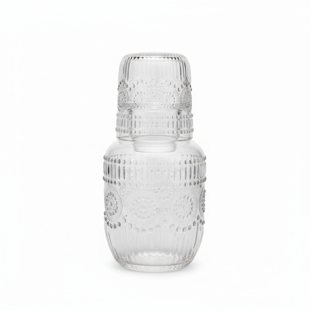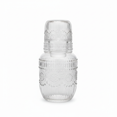 Kjo shishe elegante prej qelqi transparent me reliev dekorativ lulesh sjell një stil klasik në çdo tryezë dhe është ideale për shërbimin e whiskey-t apo pijeve të tjera alkoolike. Sipërfaqja e saj e teksturuar ofron kapje të sigurt dhe thekson pamjen vintage, ndërsa kapaku/gota prej qelqi në të njëjtin stil e plotëson setin. Dizajni i trashë dhe i qëndrueshëm e bën të përshtatshme si për përdorim të përditshëm, ashtu edhe për momente të veçanta me miq e familje.