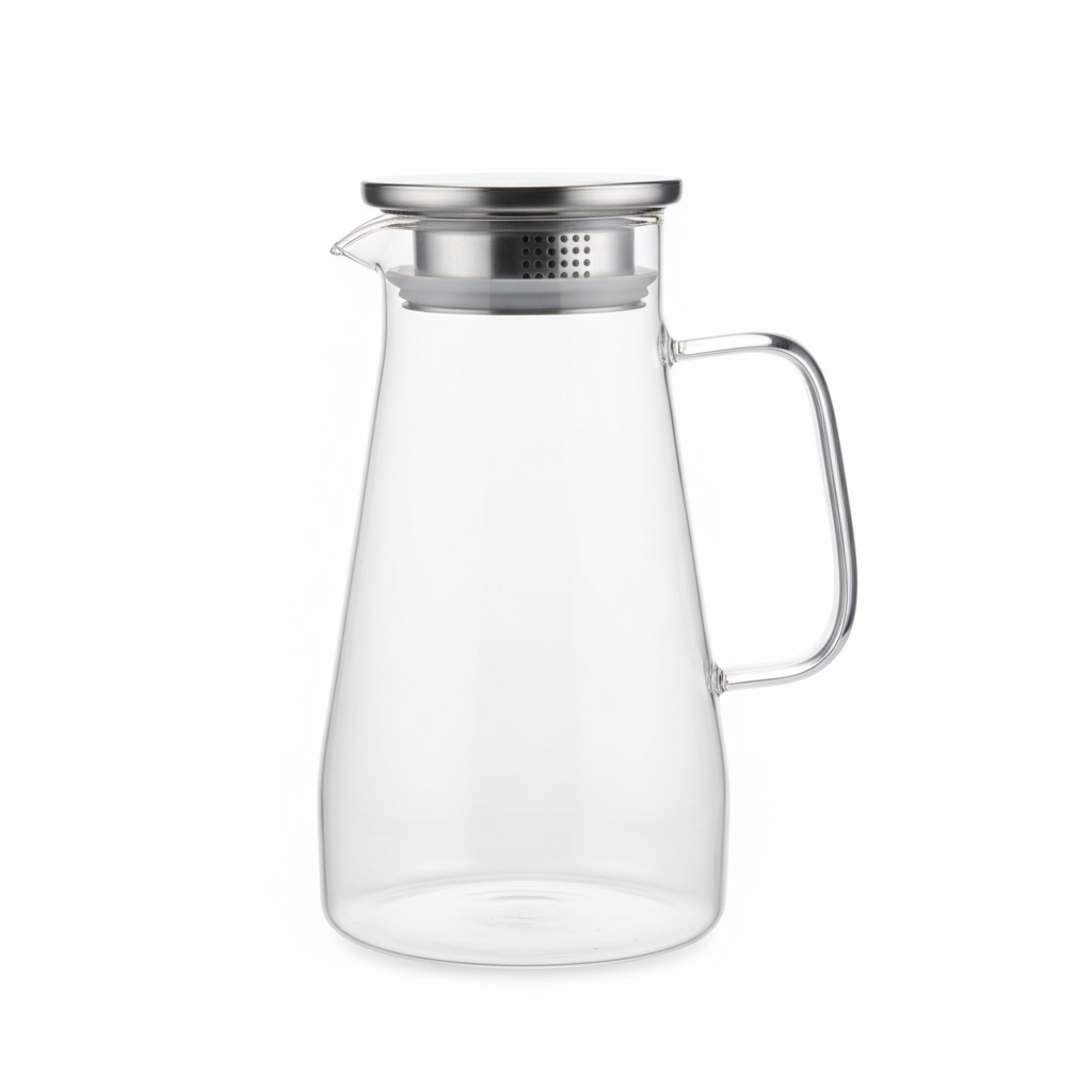 Kane elegante prej qelqi transparent me kapak gri metalik, ideale për servirjen e ujit, lëngjeve dhe çajit të ftohtë në tavolinën e përditshme ose për mysafirë. Dizajni me fund rrethor dhe dorezë qelqi të integruar siguron stabilitet dhe mbajtje të lehtë gjatë hedhjes. Kapaku metalik përfshin vrima sitëse për të mbajtur copat e frutave ose akullin brenda enës gjatë derdhjes. Kapaciteti prej 1.5 litrash është perfekt për familje të vogla ose shërbim në tryezë.