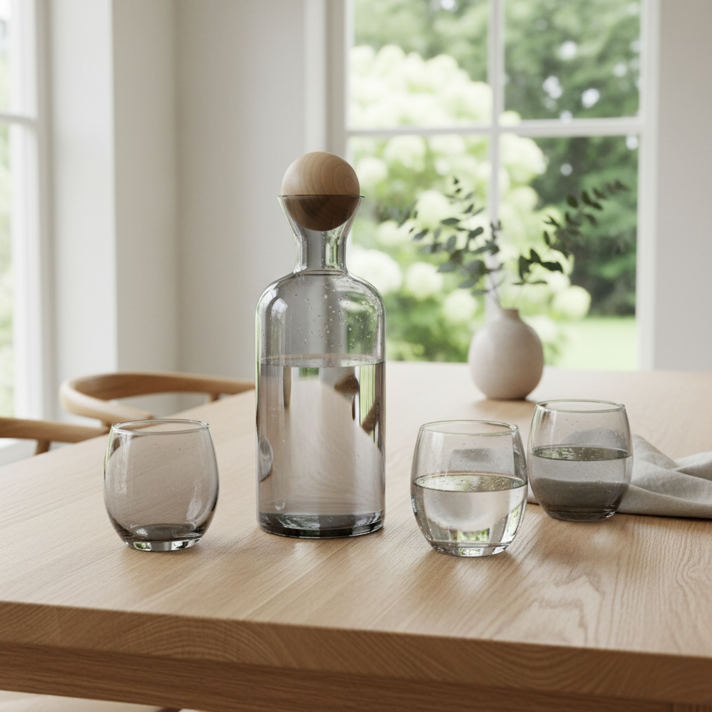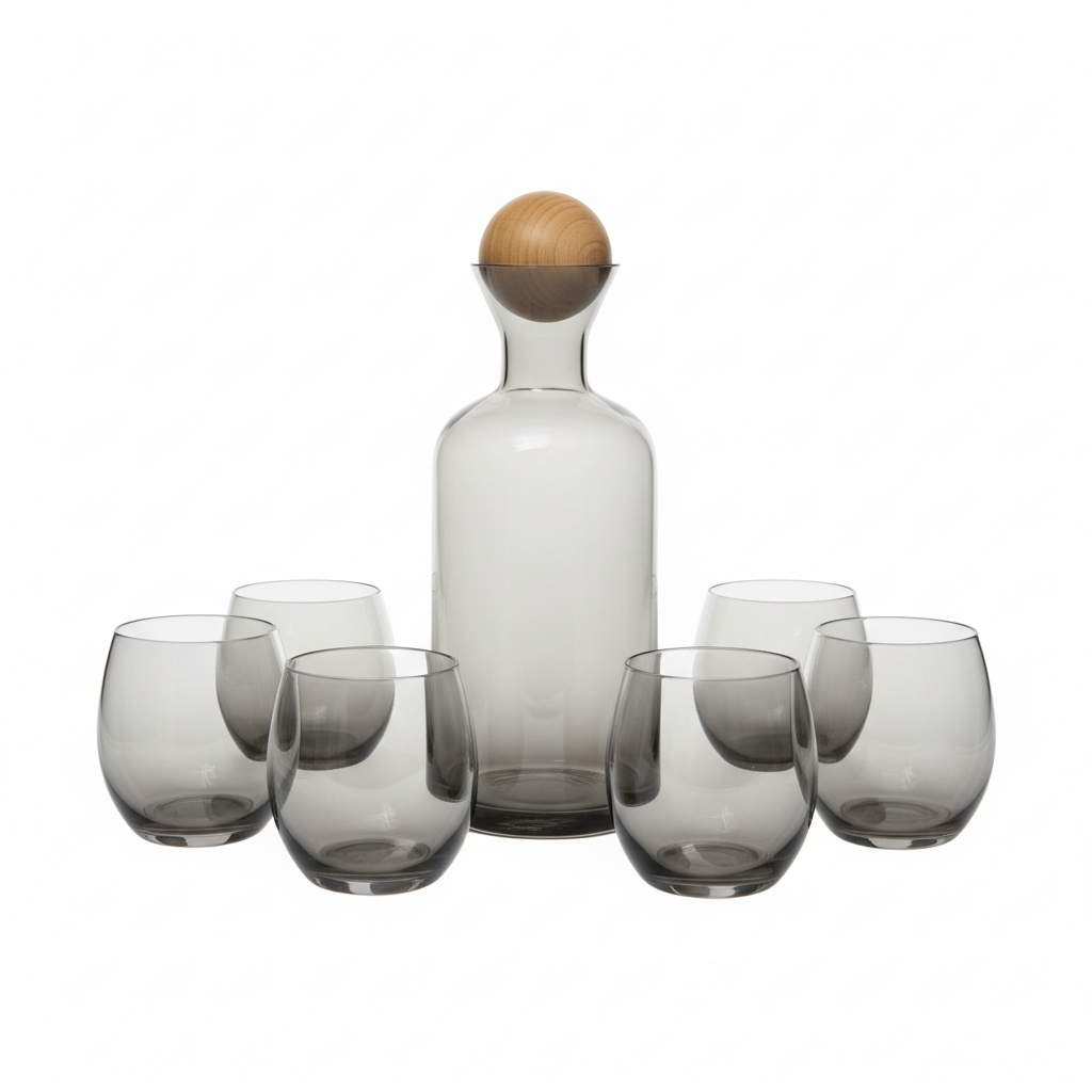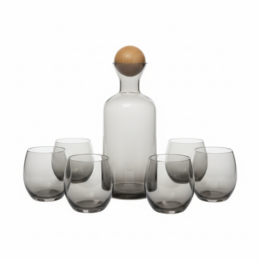 Seti prej qelqi gri të tejdukshëm sjell elegancë të përditshme në shërbimin e pijeve, nga uji e lëngjet deri te pijet e tjera të preferuara. Karafili me tapë druri kombinon funksionalitetin me estetikën minimaliste, duke u bërë një element dekorativ edhe kur nuk është në përdorim.