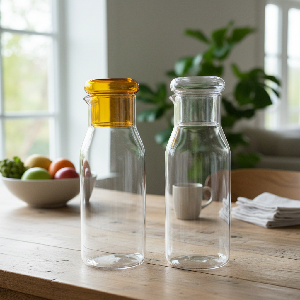 Kana e qelqit me dizajn cilindrik dhe elegant është zgjidhja ideale për servirjen e ujit, lëngjeve apo pijeve të tjera në përditshmëri dhe festa. Gryka praktike me dalje të integruar siguron derdhje të lehtë dhe pa pikime, ndërsa kapaku prej qelqi – në variant amber ose transparent – mbron pijet tuaja.