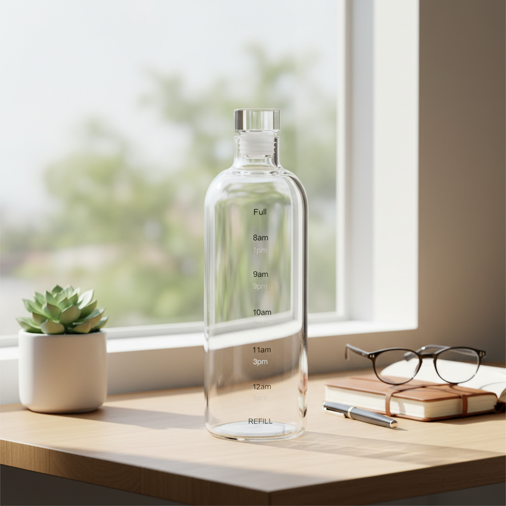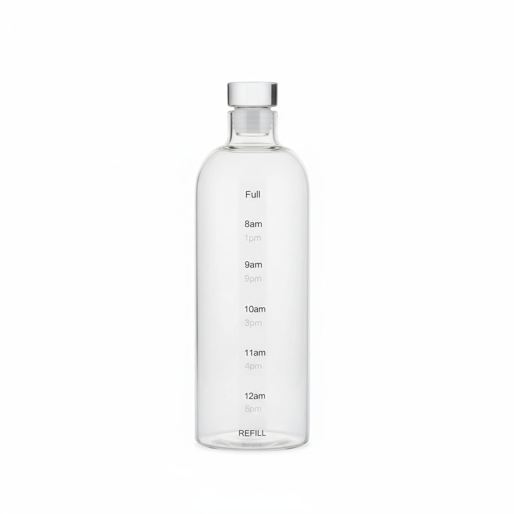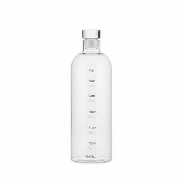 Kjo shishe elegante qelqi me dizajn cilindrik të lartë ka shenja orari nga 8am deri në 12am për t’ju kujtuar të pini ujë rregullisht, si dhe treguesit të qartë “Full” dhe “Refill” për të monitoruar sasinë.