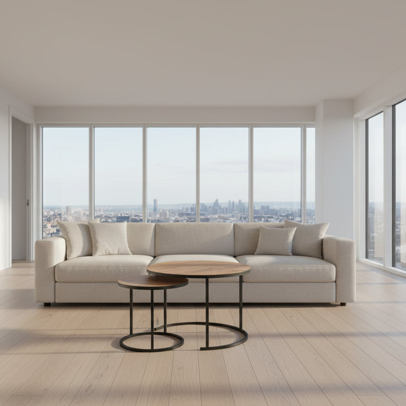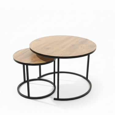 Ky set tavolinash mesi kombinon stilin modern me ngrohtësinë natyrale të drurit, duke krijuar një element elegant dhe funksional për dhomën e ndenjes. Me dy tavolina të rrumbullakëta në përmasa të ndryshme, ofron fleksibilitet maksimal në përdorim dhe organizim.