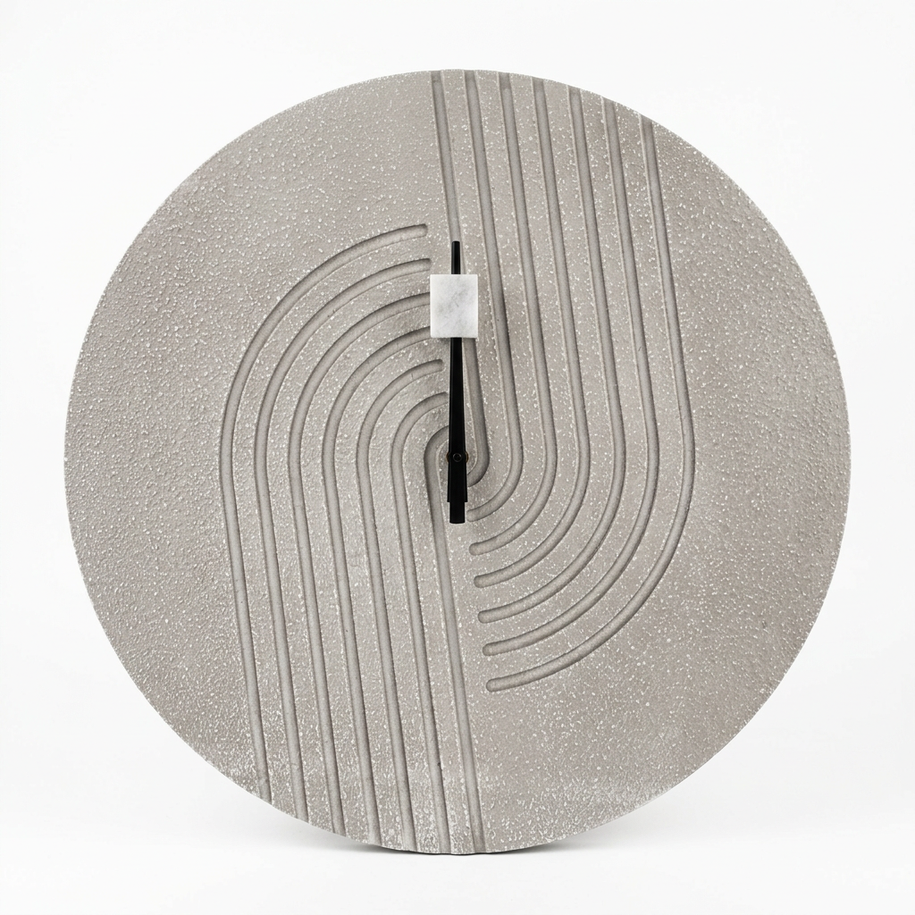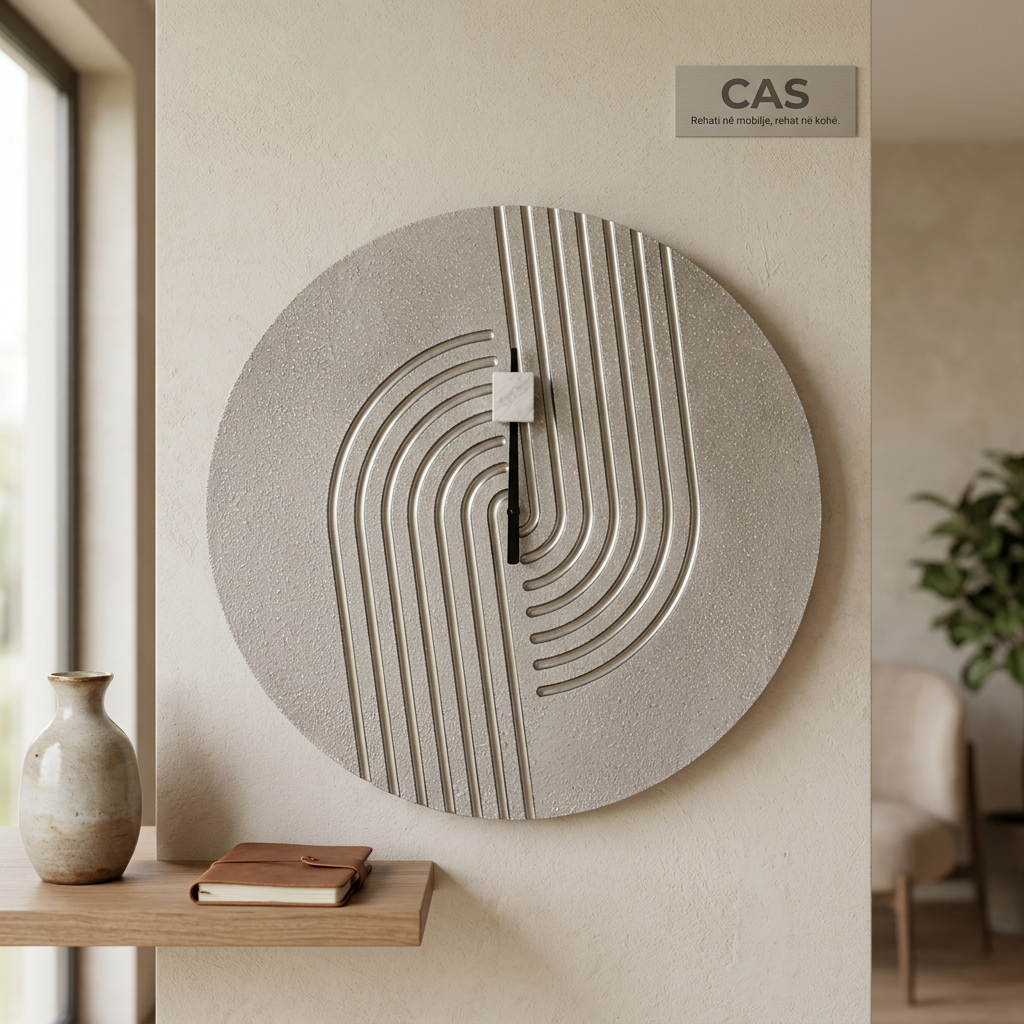 Kjo orë muri rrethore me sipërfaqe imitim guri me teksturë sjell një pamje elegante dhe të pastër që kombinohet lehtësisht me çdo stil arredimi. Modeli dekorativ me vija të harkuara në reliev krijon një efekt interesant vizual dhe e kthen murin në pikë fokale të dhomës. Ngjyra gri e çelur / argjendtë neutrale ofron qetësi vizuale dhe përshtatet me nuanca të ngrohta ose të ftohta. Ideal për dhomë ndenjeje, korridor, zyrë apo hapësira të tjera moderne.