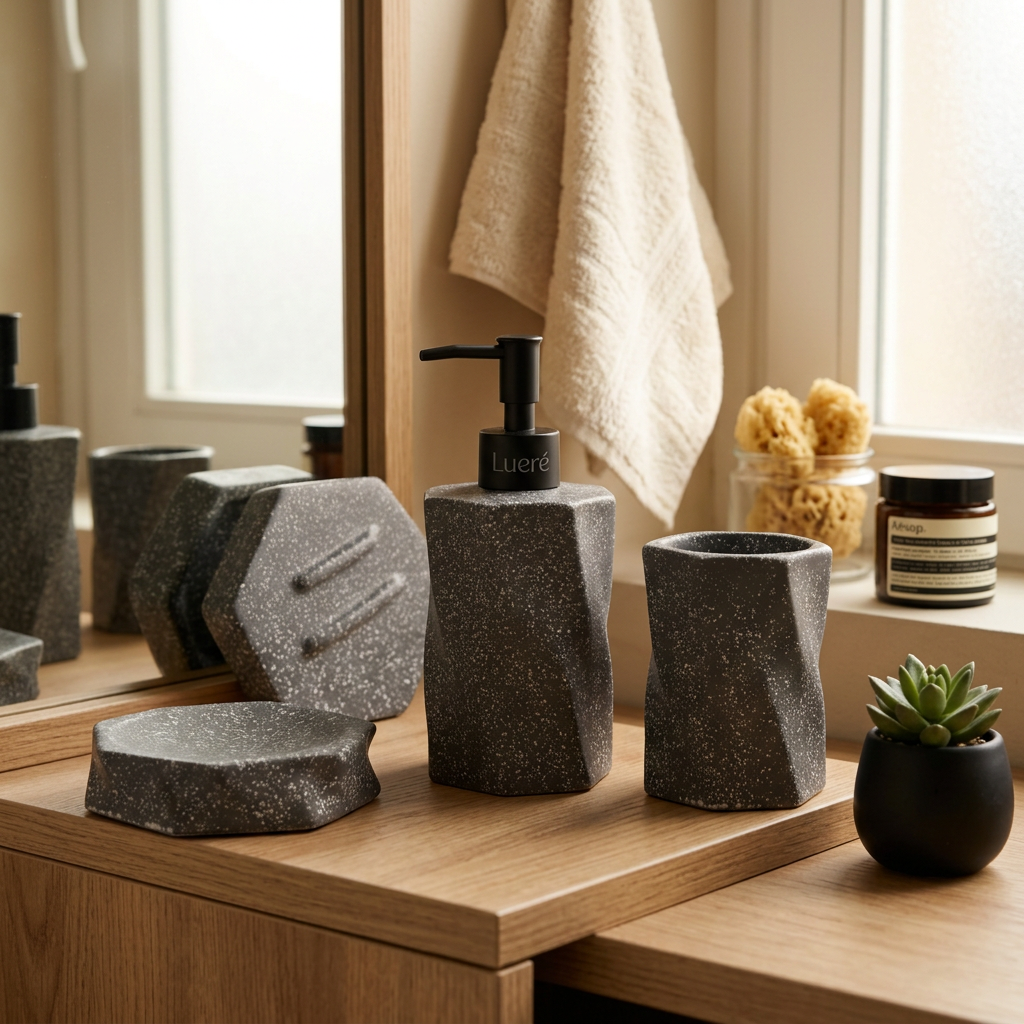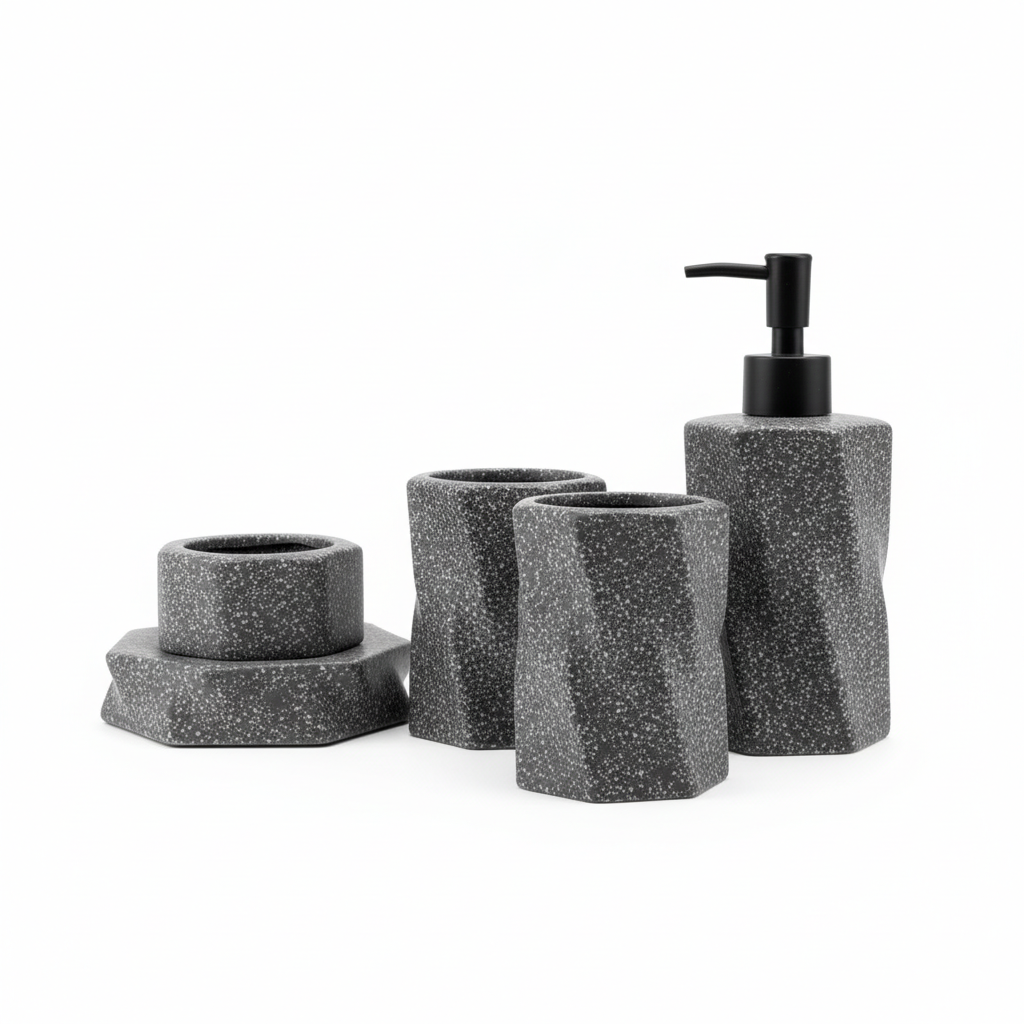 Krijoni një pamje elegante dhe të unifikuar me këtë set prej 4 pjesësh, në ngjyrë gri me efekt mermeri me pika të bardha, ideal për çdo banjë moderne. Dizajni minimalist me sipërfaqe teksturore dhe kokë pompë të zezë i jep karakter dhe rafinim lavamanit tuaj. Përshtatet lehtësisht si në banjat familjare ashtu edhe në ato të mysafirëve.