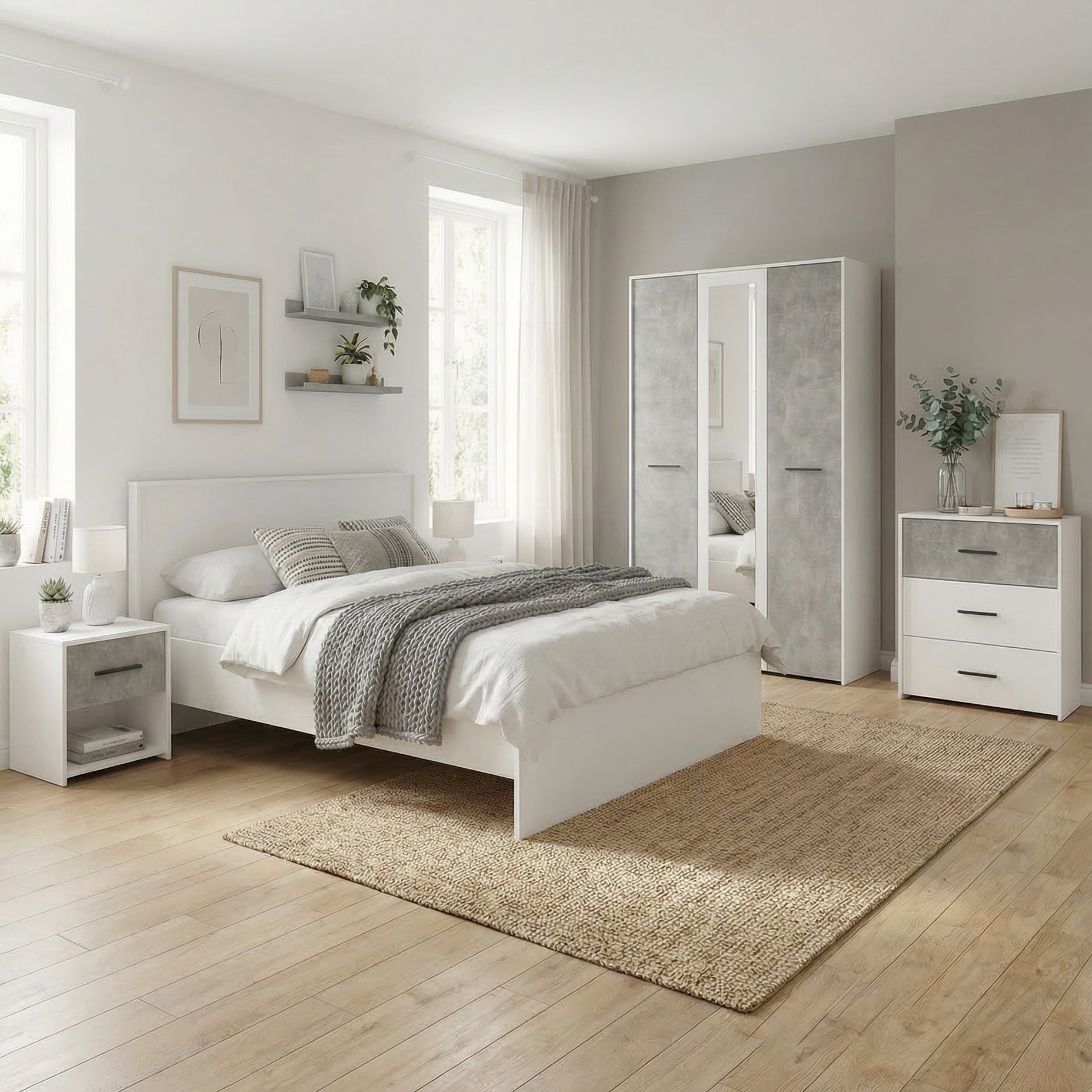 Shtoni një dimension të ri stili në ambientin tuaj me setin e dhomës së gjumit Verda. Ky variant i koleksionit ndërthur pastërtinë e të bardhës me elegancën neutrale të grisë (aspekt betoni/teksturë moderne), duke krijuar një hapësirë gjumi që ndihet sa moderne, aq edhe çlodhëse.