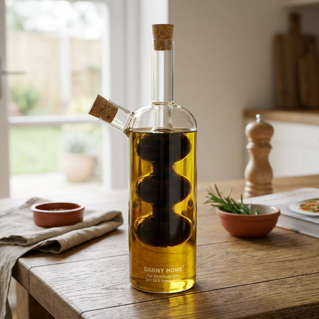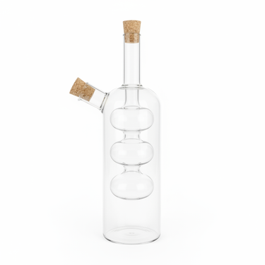 Shishja funksionale 2 në 1 me qelq borosilikat me cilësi të lartë ju lejon të ruani dhe servirni vajin dhe uthullën në një enë të vetme elegante. Dizajni transparent bën të mundur shikimin e përmbajtjes në çdo moment, ndërsa dy gryka të ndara me tapë prej korku sigurojnë mbyllje të mirë dhe derdhje të kontrolluar.