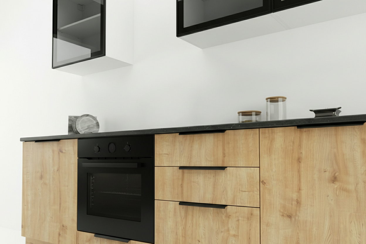Estetikë Luksoze: Kombinimi i drurit me të zezën është aktualisht ndër më të kërkuarit në dizajnin e brendshëm, pasi duket shumë më i shtrenjtë se sa kuzhinat njëngjyrëshe.
