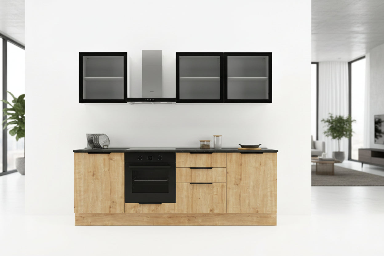 Funksionalitet 240cm: Me gjatësi standarde 2.4m, ajo ofron gjithçka: zonën e lavamanit, hapësirën e punës mbi banak, dhe dollapë të bollshëm (të mbyllur për tenxhere + me xham për estetikë).