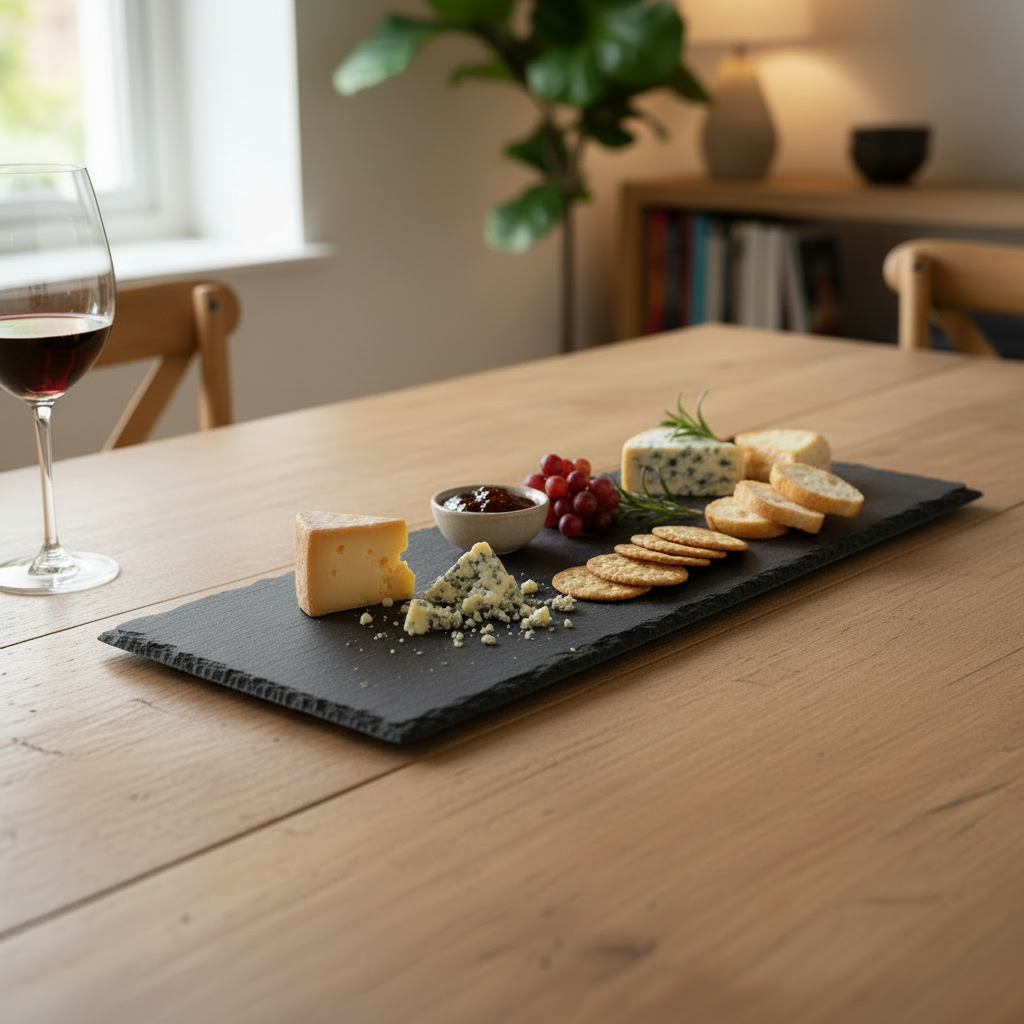Pjatanca drejtkëndore nga guri shkist me ngjyrë të zezë ofron një bazë elegante dhe natyrale për servirjen e djathrave, mezeve apo sushit. Sipërfaqja e sheshtë dhe skajet e papërpunuara e bëjnë ideale për prezantime moderne në tryezë.