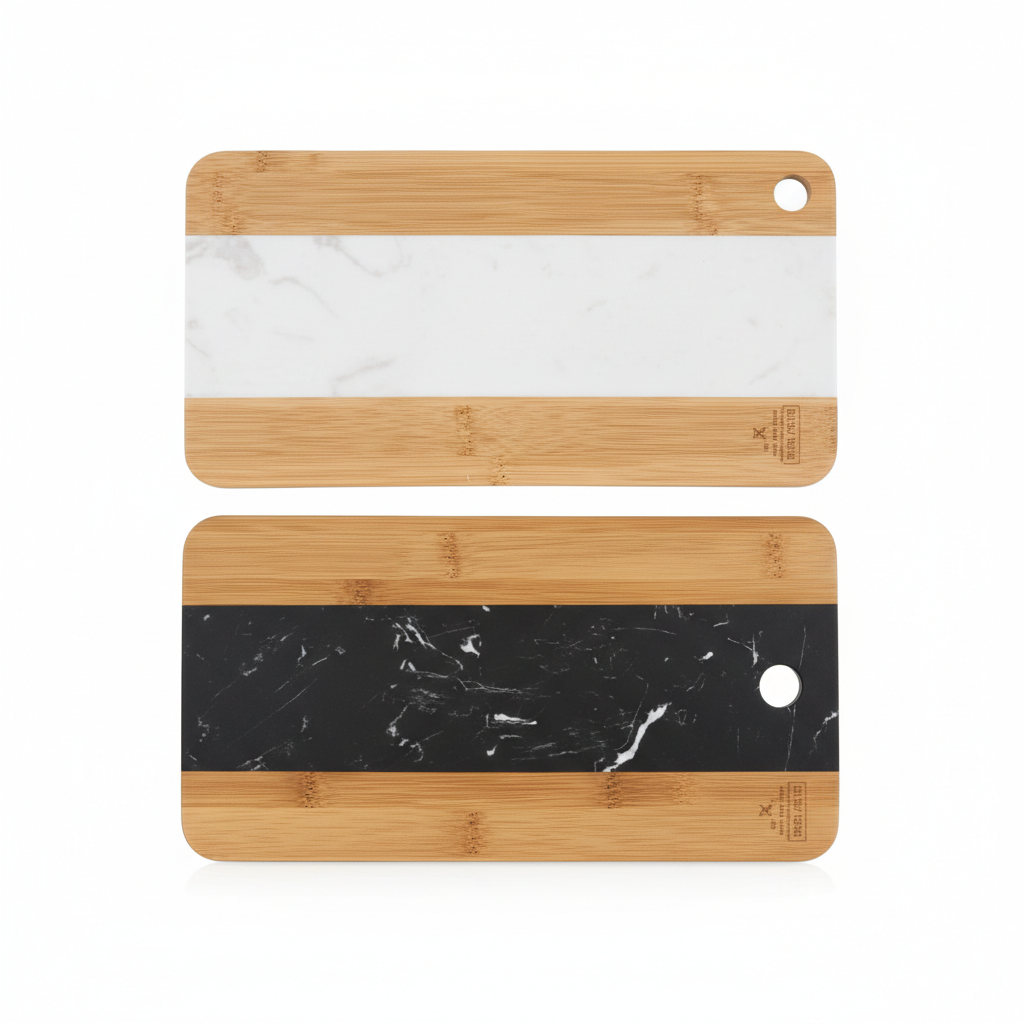 Set prej dy pjata servirjeje drejtkëndore, me bazë druri dhe panel dekorativ kontrastues në mes, ideale për prezantimin elegant të ushqimeve në tryezë.
