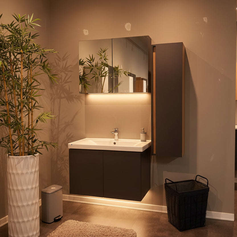 Set Mobilje Tualeti Lavina me Lavaman është një zgjidhje moderne dhe funksionale për ambientin e banjës. Dizajni minimalist në ngjyrë gri, i kombinuar me lavamanin e bardhë, krijon një pamje të pastër dhe elegante, ndërsa hapësira e brendshme ofron vend të mjaftueshëm për organizimin e përditshëm.