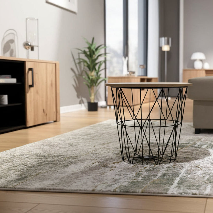 Baza e saj në formë shporte, e ndërtuar nga fije metalike të zeza të gërshetuara, krijon një iluzion optik mbresëlënës, ndërsa sipërfaqja rrethore me pamje druri të çelur ofron një kontrast të butë dhe mikpritës.